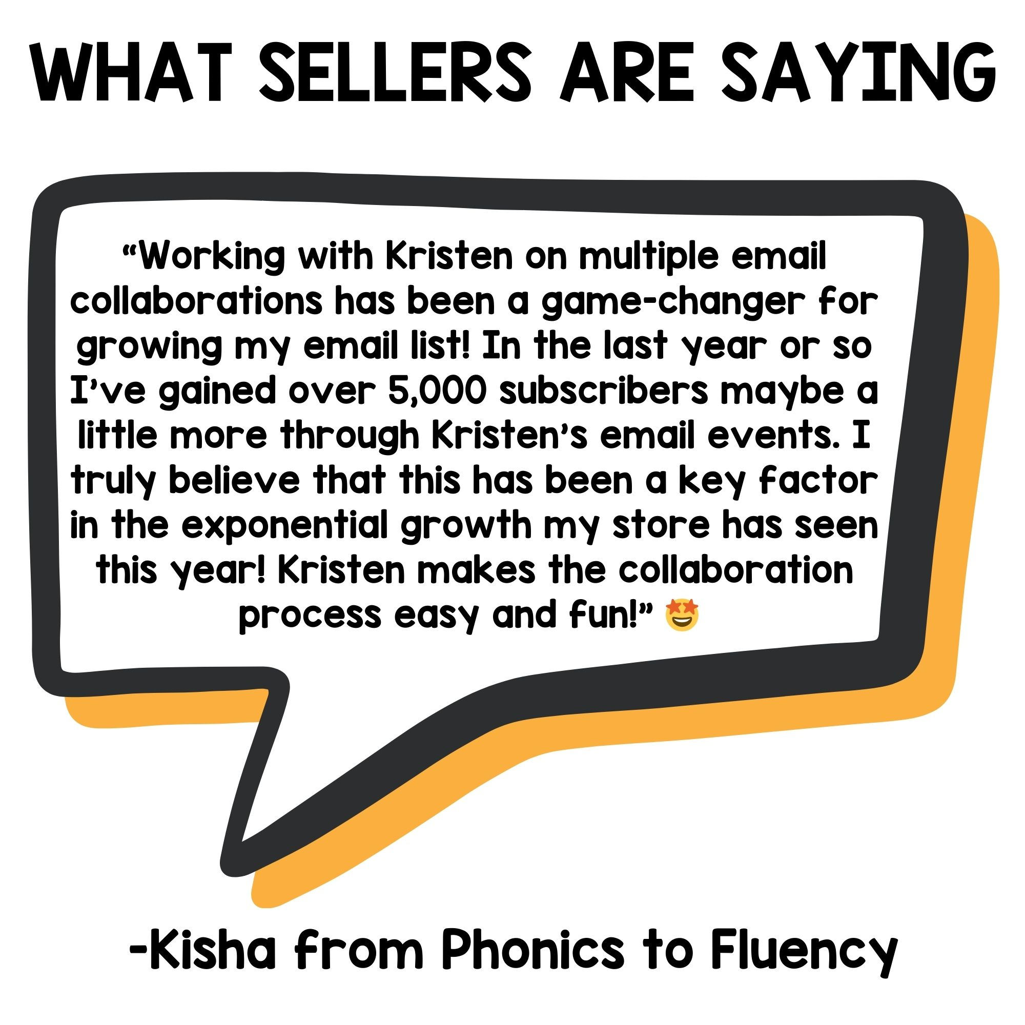 This fully structured collaboration event is designed to help K-2 teacher sellers increase email subscribers and boost revenue.